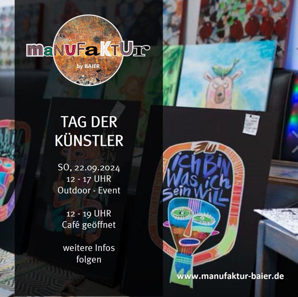 Am „Tag der Künstler“ könnt ihr bei uns viele verschiedene Künstlerinnen und Künstler in Aktion erleben. Freut euch auf: Damaris & Sabrina in unserer Kreativwerkstatt der manufaktur by BAIER Julia Stefanie mit „Traumfänger handgemacht“ Marco, Artworks.mg mit „upcycling deco“ @artworks.mg Monika, mit ihren Bildern „Abstrakte & farbenfrohe Acrylmalerei“ Jeanette mit Netles Kartenkunst & Schmuckallerlei „Grußkarten, … TAG DER KÜNSTLER weiterlesen